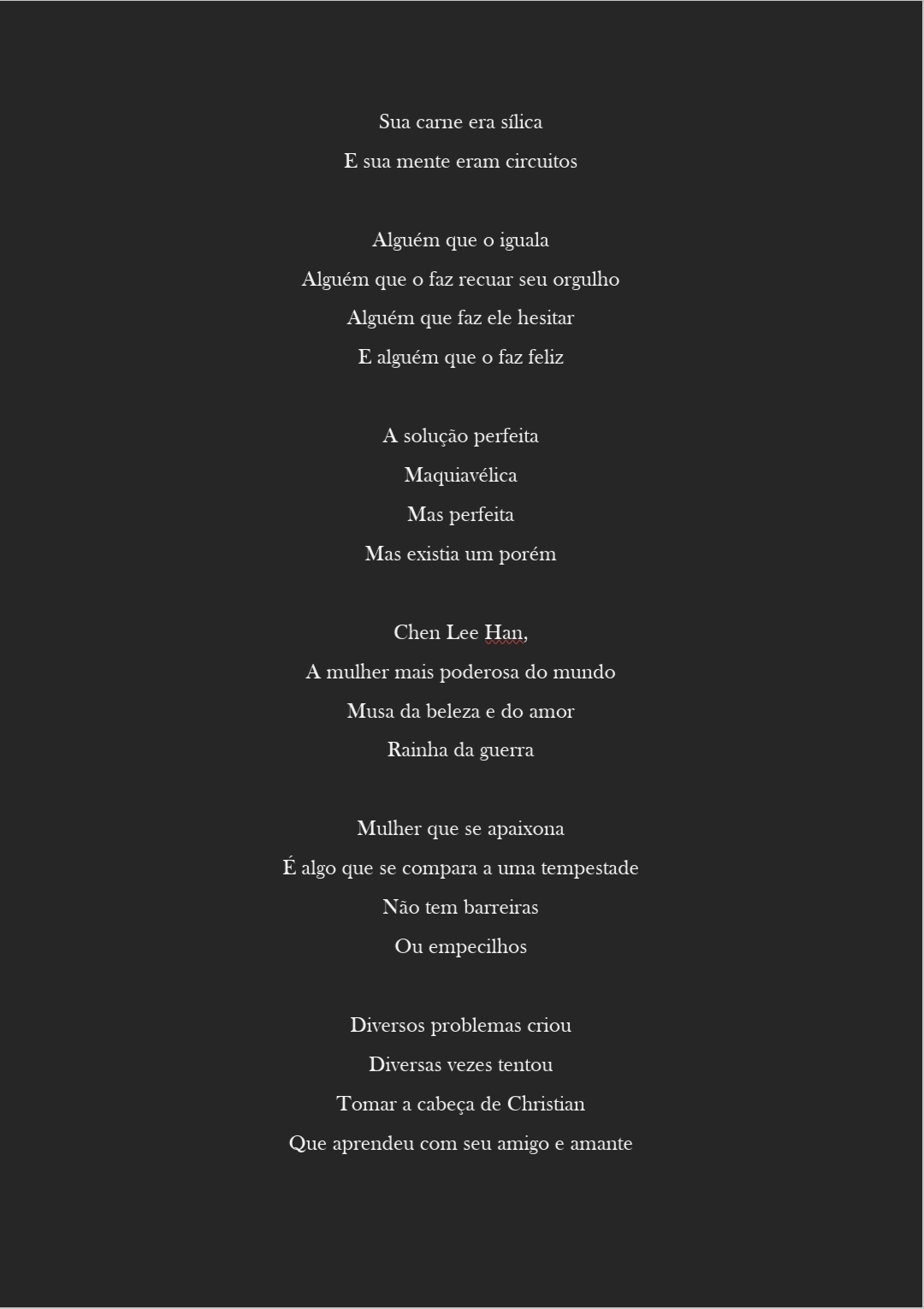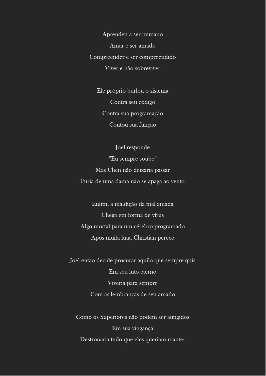 Decidi então usar a mesma formatação da história, também conhecida como “Sha Naqba Imuru” (aquele que ao abismo viu) e traduzi ela para uma linguagem americana Cyberpunk.